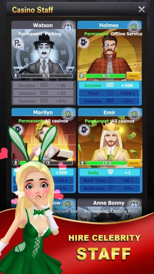 2、吸引尽可能多的人来光顾。闲置赌场大亨游戏支持放置休闲玩法;