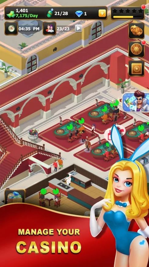 赌场帝国空闲大亨(Casino Empire: Idle Tycoon)是款休闲类经营游戏,在这款游戏内玩家将经营一家赌场,我们需要来在游戏内不断的进行经营来让自己获得更多的奖励,游戏内玩家有着多种的选择可以来让自己获得更多的资产,玩家需要在游戏内来不断的进行投资让自己获得更多的金币哦!