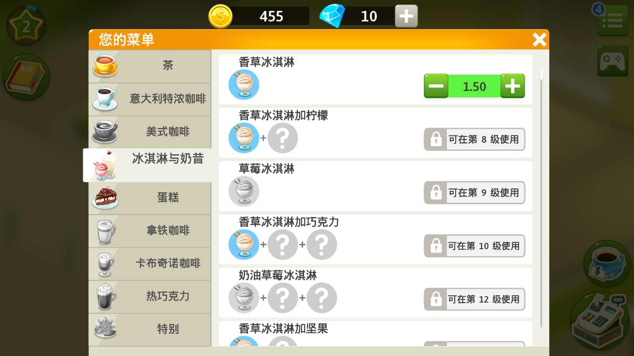 这款元气咖啡厅游戏还温馨的给玩家各种剧情提示,在游戏中不仅仅有咖啡还有各种甜点美食能帮你增加收入哦。