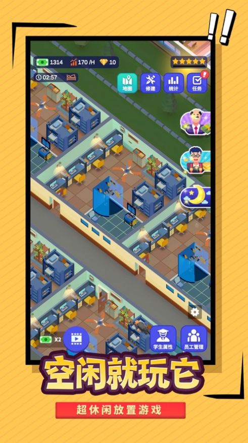 模拟建设学校是一款花费十年打造的经营类手游,在这款游戏里玩家将会扮演一个建造学校的校长,从一块空地上按照要求建造出一所学校来,并且不仅仅要建造外部的设施,里面的宿舍楼,教学楼甚至是寝室和卫生间都是要玩家去策划的,细节就是这么多,非常的好玩。
