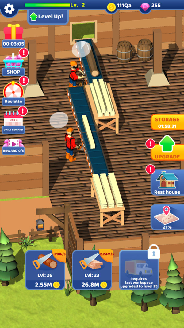 2.砍树能够取得更多金币,金币能够用来晋级你的员工,进步他们的砍树效率。