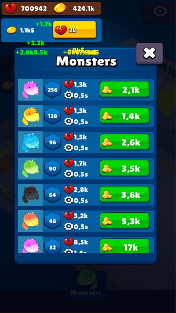 3.80多种怪兽,如恐龙、螃蟹、粘液、章鱼等。,是为玩家收藏而设计的,达到一定等级后可以解锁。有些怪物的属性和技能非常强大。