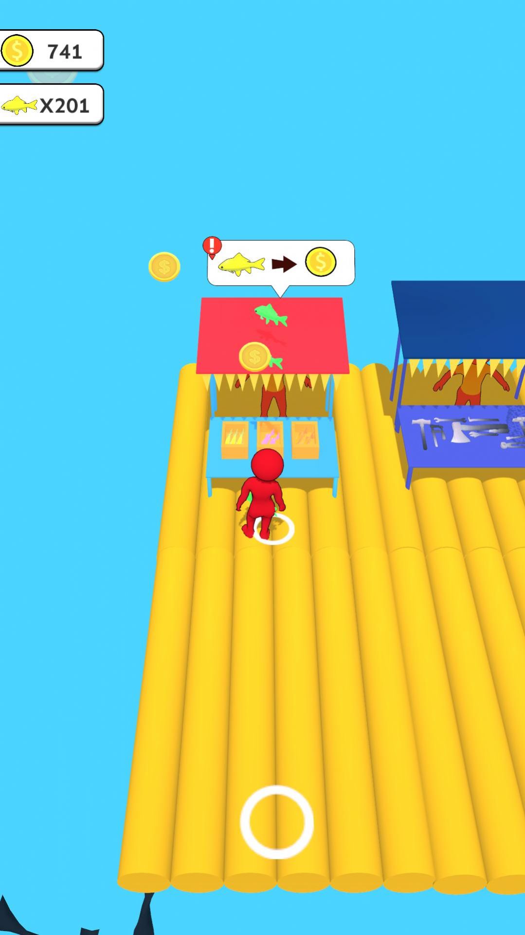 2、快速升级捕鱼设备,卖钱后继续扩建,把小木筏建造成一个大型浮岛。