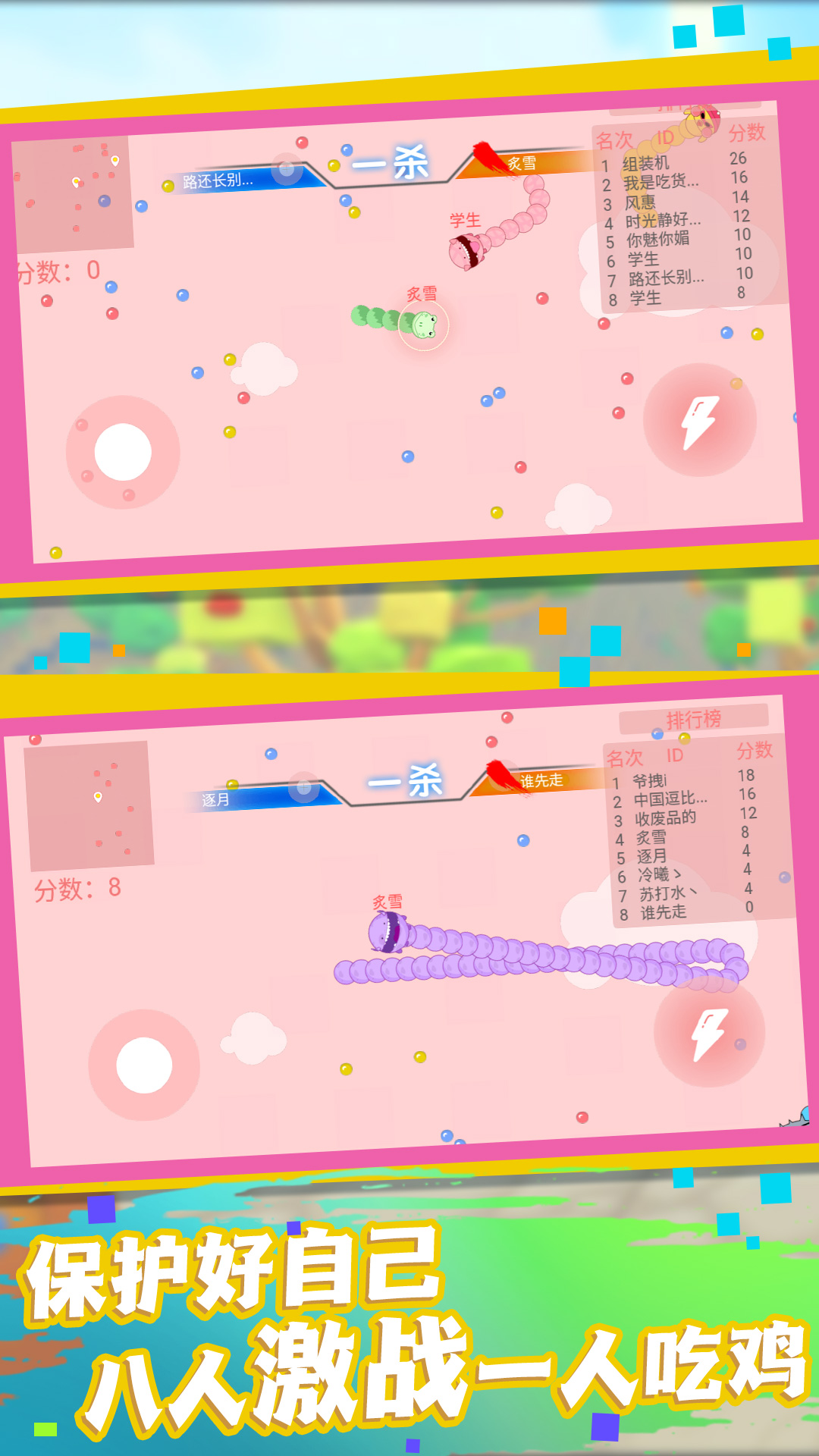 3、当蛇头碰到其他的小蛇,都会造成死亡,化身成为能量小点补给。