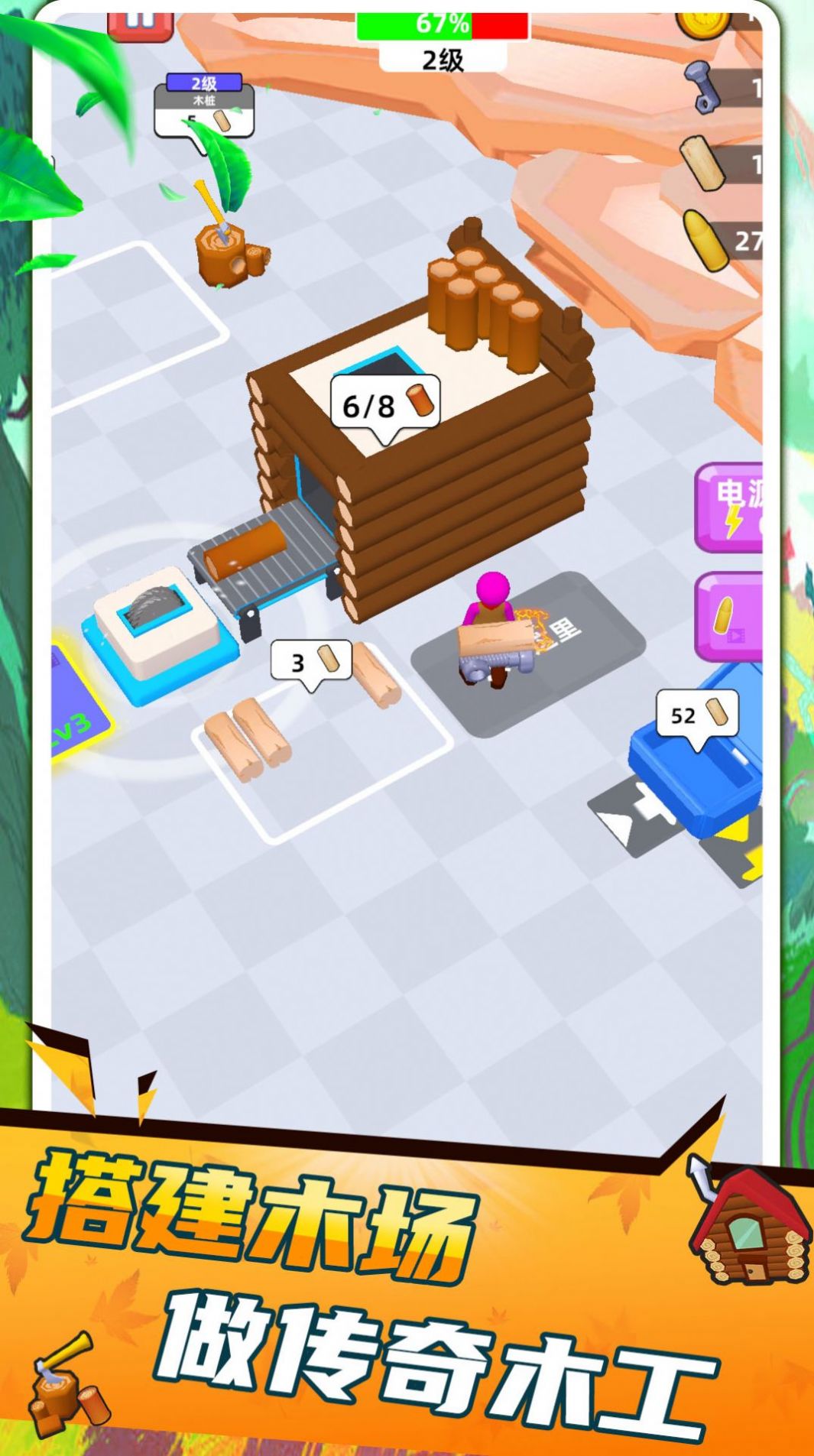 2、木材不同材质将在不同的场景中生长。玩家需要操纵小人物来收集更多木材。