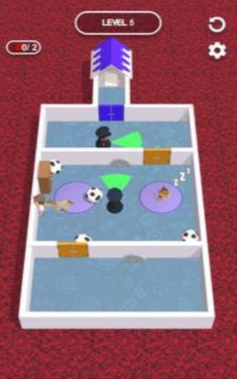 2、除了这些小狗以外,在关卡里面还有一个巡逻的人在游荡,需要避开这个人的视线。