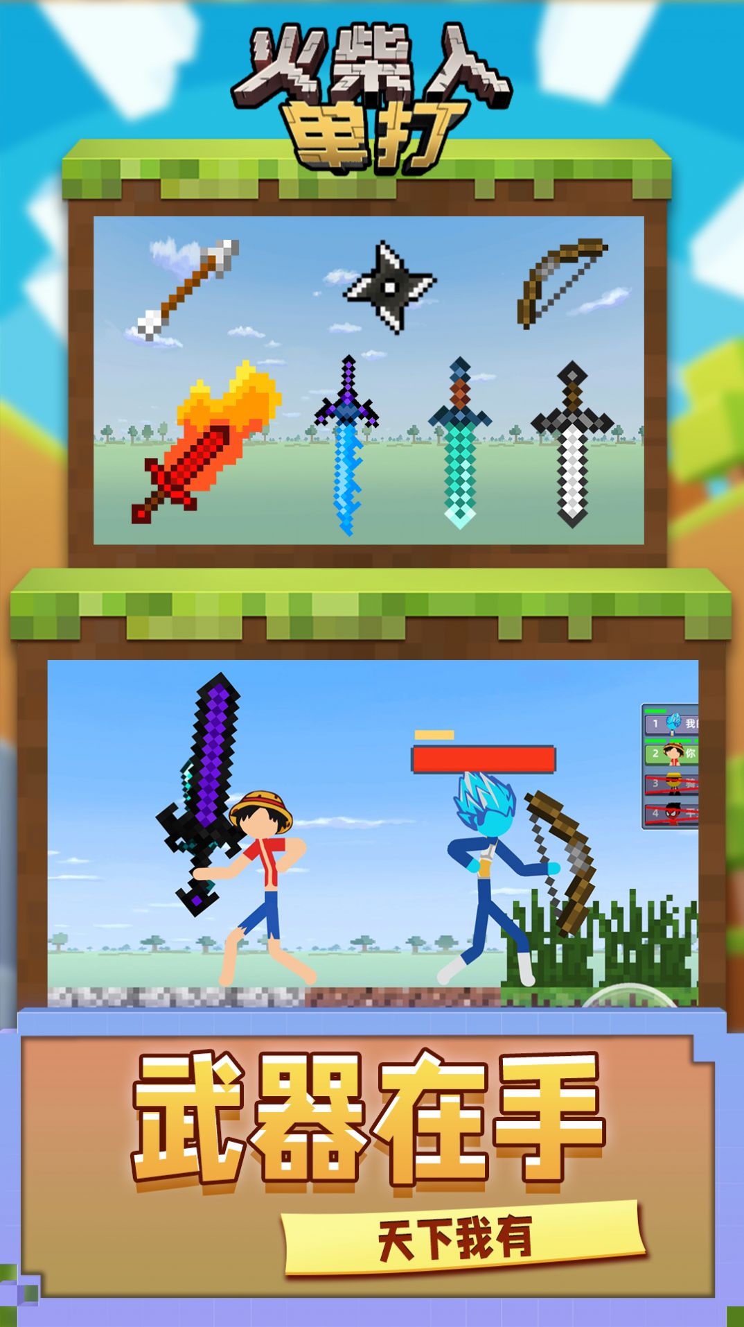 1、全新像素格斗场开启,解锁不同的道具武器来一场单打对决。