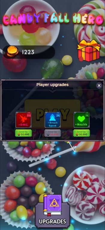 3、获得金币或道具,增加自己的战斗力,糖果坠落英雄还能使用金币升级战斗属性,提高战斗力。