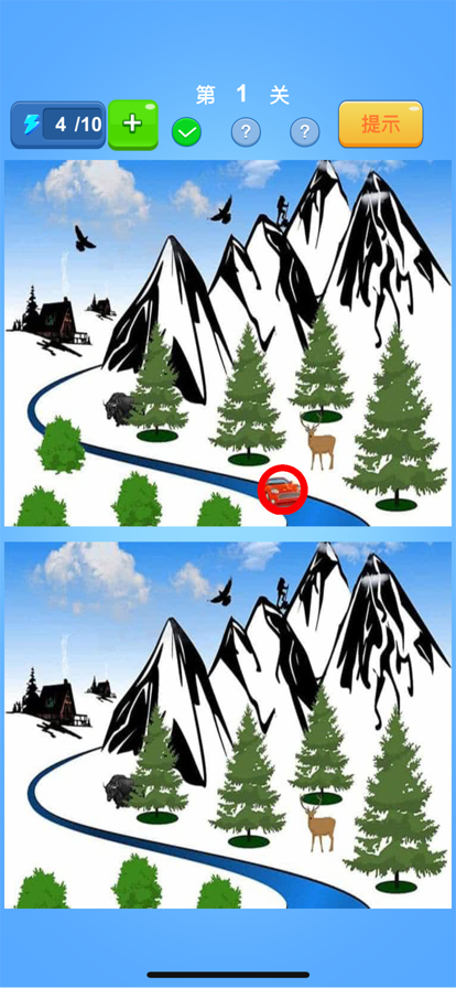 1、简单的操作只需要你点击两张图片中不同的地方,完成所有不同地方的查找方为过关;