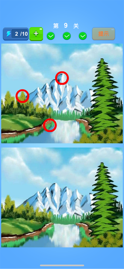 1、通过简单地操作来找寻两张图片上的不同之处,达到数量要求即可通关。