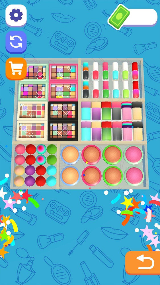 1、整理物品的解压的玩法,在整个游戏中将需要将这些化妆品合理的整理到归纳盒中。