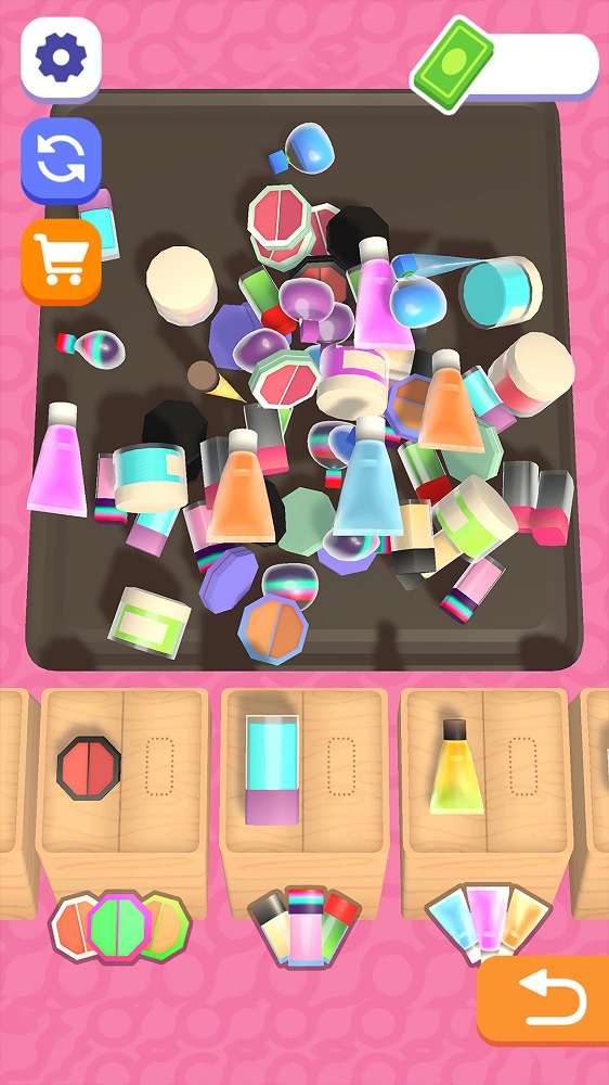 化妆品全部都堆放在一个地方,非常的杂乱,玩家需要做的事就是给它们整理清楚。