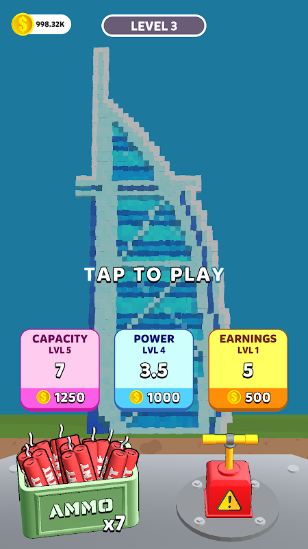 这款游戏的玩法十分的减压,玩家需要利用游戏中的炸药来不断地爆破各种房子。