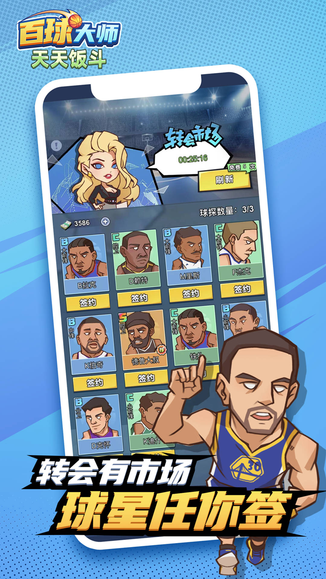 天天饭斗百球大师这款游戏主要休闲模拟的类型,游戏的主题都是围绕着篮球题材来设计的,游戏中有非常多明星球员,在这玩家可以通过完成任务收集,然后再用它们组建成强大的球队,带领自己的球队去进行各种各样的比赛,通过赢得比赛赢得大量的资金,这些资金还能将自己的球队扩张。