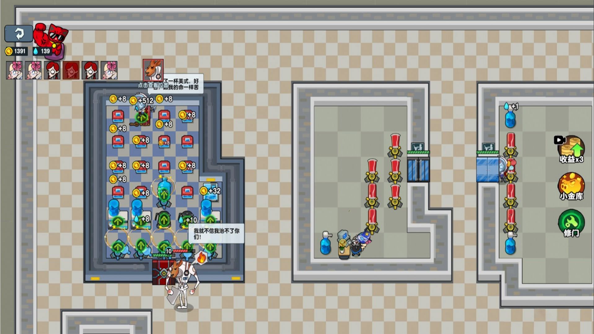 3、太空人需要守护房间并放置各种塔防道具来攻击袋鼠人,需要充分利用各种道具!