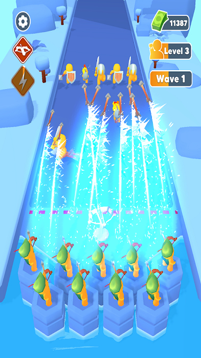 2、相同的弓箭手可以直接合并,不断获取高等级弓箭手,获得更多射击效果,轻松阻挡敌人。