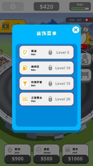 1、游戏中的赛道你自己也可以不断的升级,可以吸引更多的赛车手。