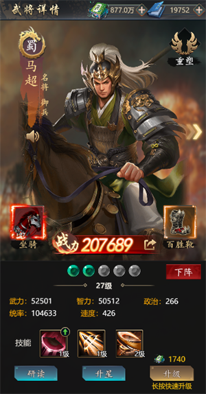 每个武将可驾驭一匹马,可提供血量、智力、速度、政治等属性。