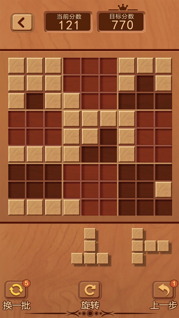 2、使各个不同形状的方块能够填满棋盘中的任意一个九宫格或者行列后消除得分。