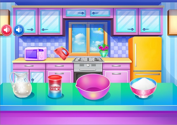 整理干净厨房后前往超市购买原材料,之后回到厨房按照各种不同的任务配方制作各种不同的糖果出售,卖出更多的糖果获得更多的金币来装饰自己的厨房。