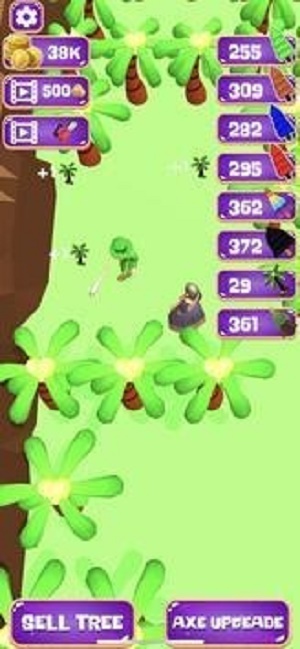 5.在游戏中的玩家可以是拿一个斧头砍树赚钱,金币可以用来级斧头,继续切割树并卖钱。