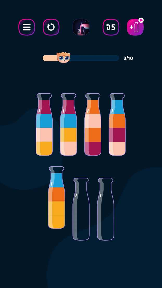 2.在这个游戏中有不同的关卡,你可以尽情挑战,不要倒错液体,否则你将不得不重新开始;