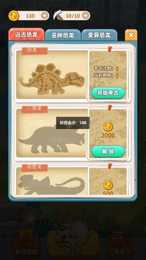 1、游戏中有许多不同的场景供你探索考古,让你在游戏中有更多的选择,找到更多不同的恐龙化石。