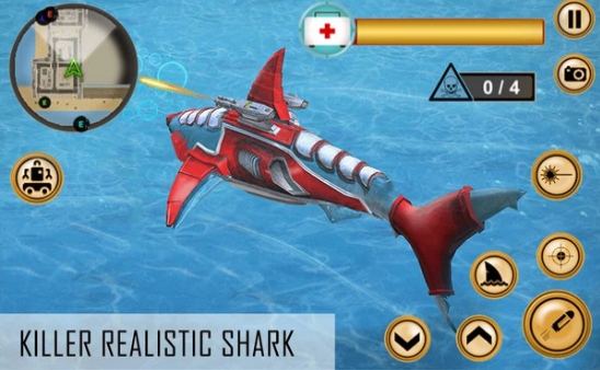 2、正确使用先进的机器人,随时可以变身机器鲨鱼在海中潜行,并根据需要杀死各式敌人。