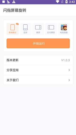 闪指屏幕旋转app是广州米鹿网络科技有限公司专为地铁跑酷玩家开发的屏幕旋转软件。该软件操作简单,不需要复杂的设置,只需轻轻点击即可快速设置屏幕旋转方向!此外,闪指屏幕旋转app还特别为地铁跑酷玩家定制了专属的屏幕旋转设置,无论是正常版、国际版、特别版,均可一键设置,并且软件随着游戏版本的更新也会逐步升级,保证玩家随时都能享受到最佳的屏幕旋转效果!