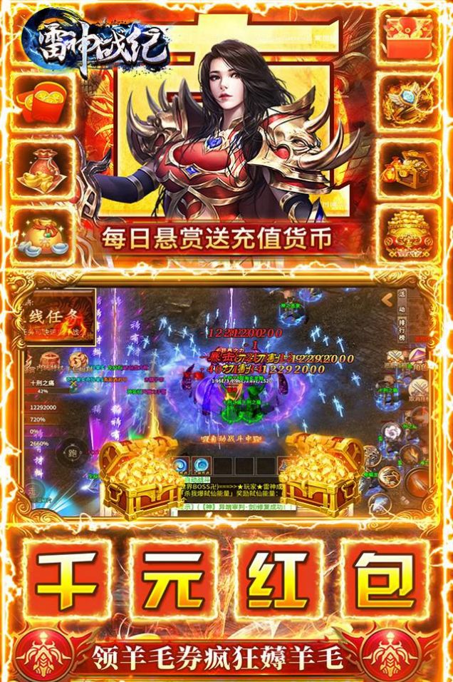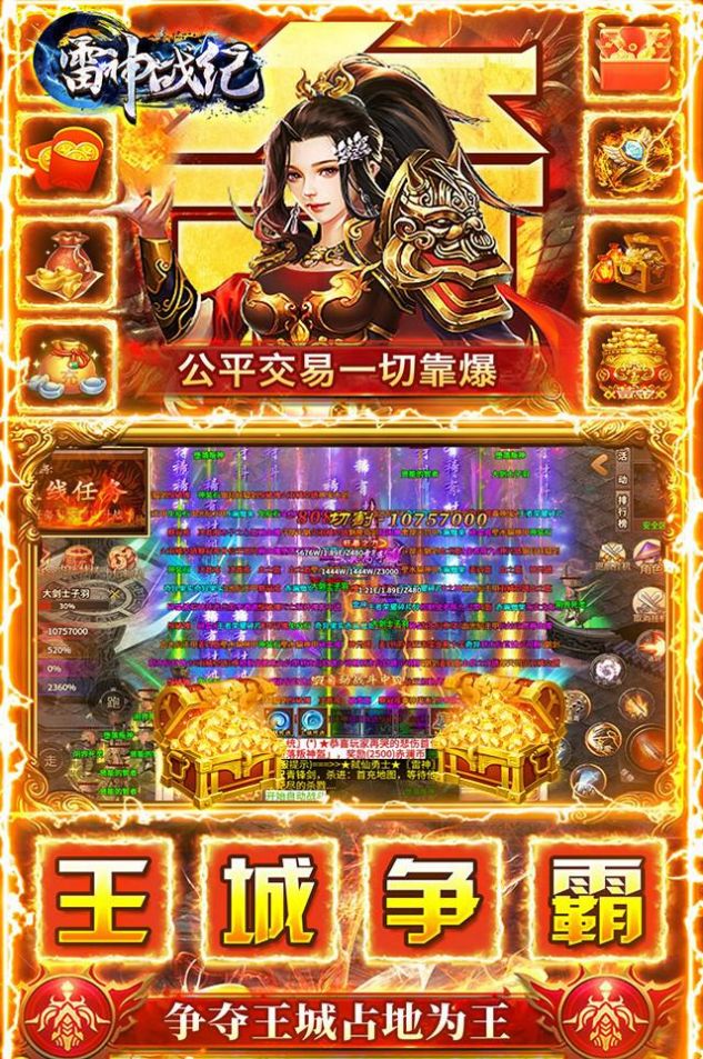雷神战纪内玩亿爆打金可以疯狂打金的一个热血传奇游戏,最具有特色的地方是它的金币系统。玩家可以通过完成任务、打败敌人或者在市场上进行交易获得金币,在游戏中购买各种道具和装备,以提高玩家的能力和战斗力。另外,游戏中还设有贵族阶级和荣誉值等高度的奖励机制,让玩家不断追求更高的荣誉和地位。