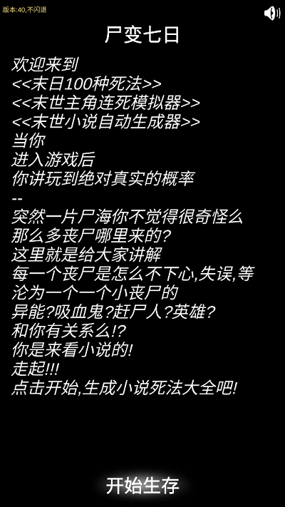 尸变第七日,是一款纯文字向的末日生存冒险游戏,这种类型的游戏更像是互动小说,玩家需要通过自己的想象力来脑补游戏的画面,这也让游戏有了更加丰富的玩法以及更加有深度的剧情。游戏讲述了在丧尸病毒爆发后的世界里,主角将以自己的家为基点,探索这个恐怖危险的世界,游戏还有多种多样的剧情等待玩家们的探索和发现。
