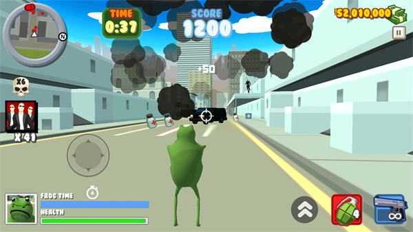 2.玩家只需要操控游戏中的青蛙与赛道中所出现的僵尸以及坏人展开殊死搏斗,击败所有的对手才能够进行前进。