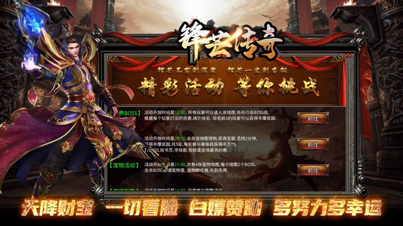 2、支持装备回收,全民打宝,福利多,公平绿色的游戏环境,快来试玩吧。