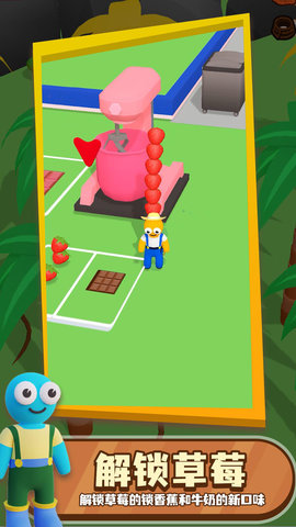 2、把巧克力棒放在货架上,然后卖给顾客,用草莓、香蕉和牛奶等新材料解锁新口味,雇佣工人,收购新的巧克力工厂。