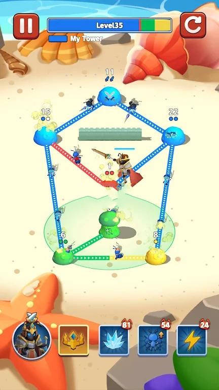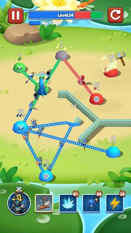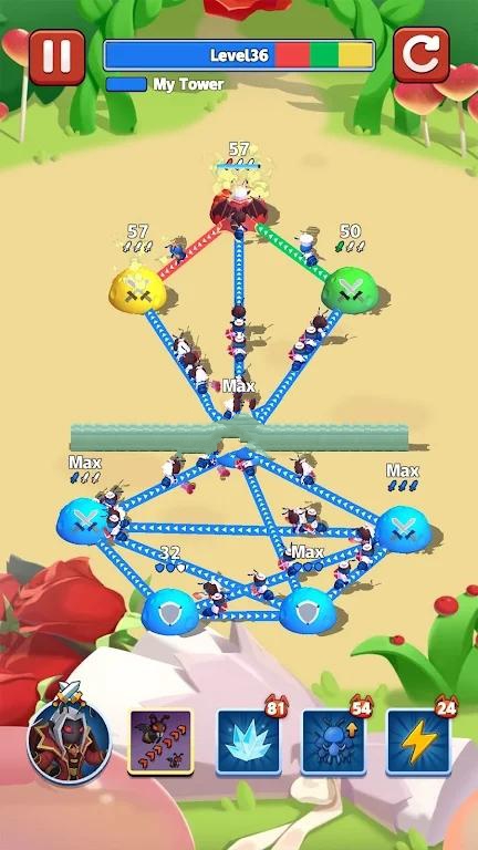 这个游戏的趣味性非常强,玩家需要让蚂蚁军队,沿着既定路线展开对抗,通过错综复杂的战场,占领敌人的基地。
