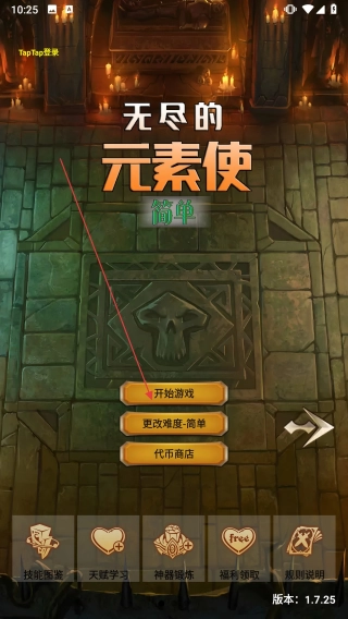 1首先,找到并打开游戏《无尽的元素使》。进入游戏界面后,点击屏幕上显示的【开始游戏】按钮。随后,在难度选择界面中,选择简单难度模式,进而开启一段充满未知的冒险之旅。