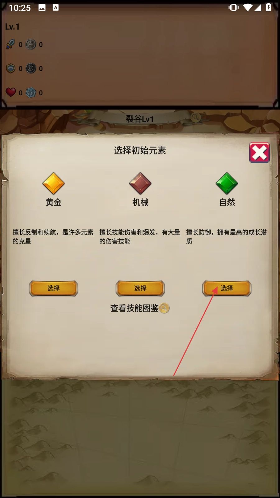 2、选初始元素,推荐【自然】,点对应【选择】,确定职业方向。
