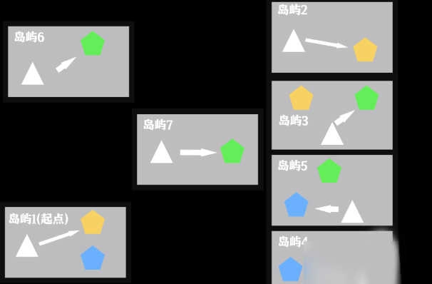 本图的解密思路是:依据通关对话所提供的线索,按顺序逐个前往七个岛屿,最终抵达终点。