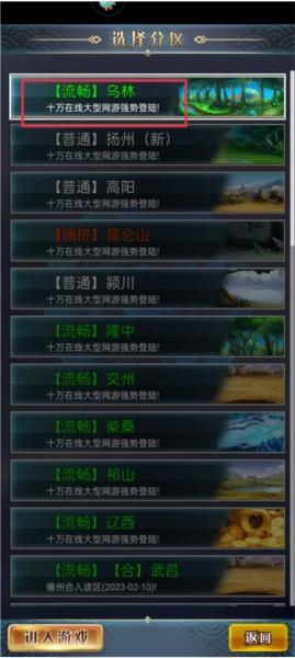 2. 进行分区选择,可供选择的分区有乌林、扬州、高阳、昆仑山、颍川、隆中、交州等,挑选完毕后即可进入游戏。