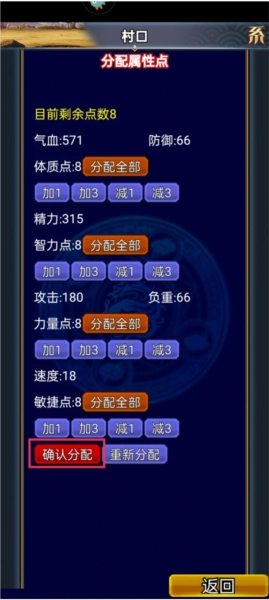 8、点击增加气血、精力、攻击、速度选项,添加完毕后点击确认分配。