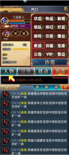 1、在游戏系统众多关键功能键中,选取其中一个极为重要的功能键:“功能”。此功能选项涵盖了诸如登出、VIP、公告、宝库、训练、教派等一系列重要功能,随后点击“教派”。