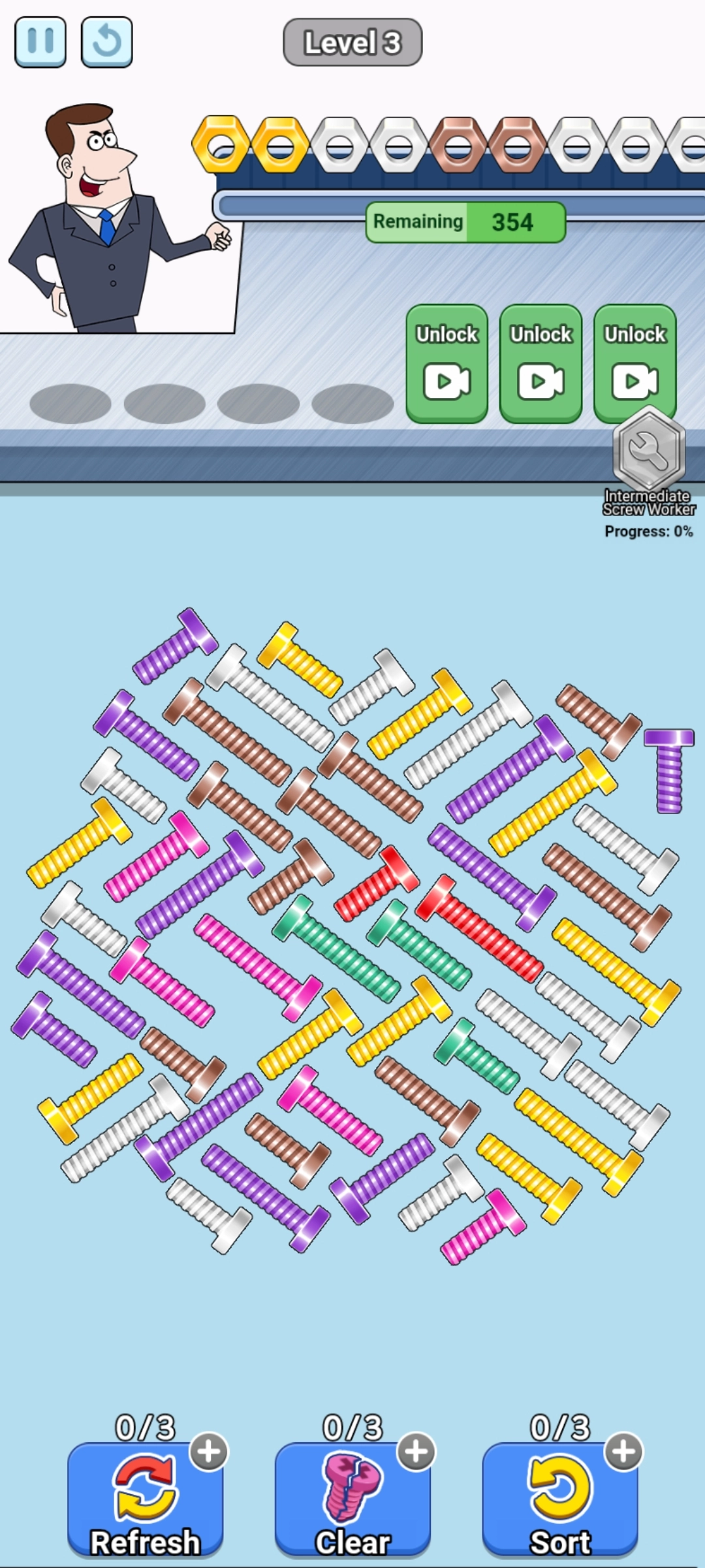 3、游戏的颜色设置清晰且明亮,使得玩家能够更轻松地区分不同颜色的螺栓与螺母。