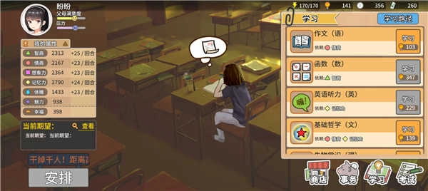 3、课程学完后,查看“安排”里的“学习”与“娱乐”。在确保父母满意度不超标、压力也不超标的前提下,通常安排3至4项学习活动,2至3项娱乐活动,且娱乐活动专门挑选能提升魅力的即可。(务必得有“学习”,不然之后可能因面子值不够,换不了黄冈密卷。 )