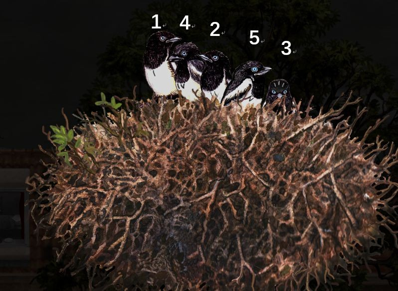 点击鸟巢后,会看到五只小喜鹊的肚子上标有罗马数字,按照数字顺序依次点击它们。等所有小喜鹊都站起来后,再从左往右逐个点击小喜鹊的头部,最后点击飞出来的那只小喜鹊就能触发剧情,接着点击Milo,即可完成本关。