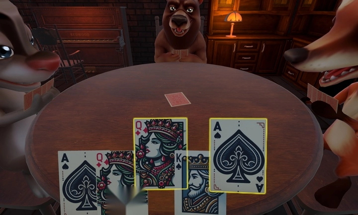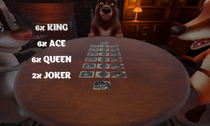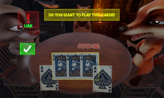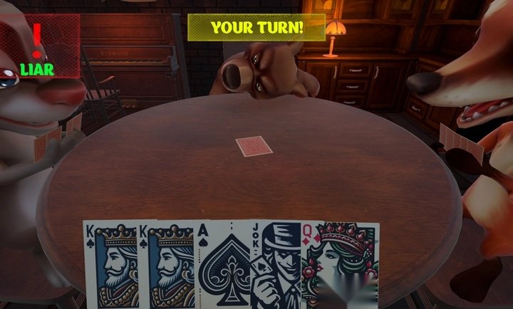判断规则:若上家打出的牌并非开局时亮出的“目标牌”,那么被开牌的玩家就得用“左轮手枪”对自己进行一次虚拟的“开枪”操作(游戏内为虚拟行为,不存在实际伤害);反之,下家则需要用“左轮手枪”对自己开一枪。