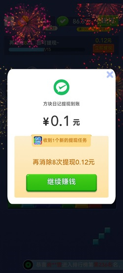 这款游戏支持提现功能,玩家通过消除方块即可获取红包奖励。刚进入游戏时,随意消除几次就能先提取0.1元;消除满8次后,还能再提0.12元。不过提取0.15元时会有等级限制,只需观看少量广告就能达到要求。游戏内所有红包提现都采用百分比机制,通过的关卡数量越多,对应的提现比例就越高。