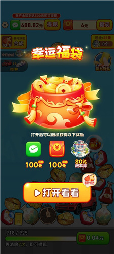 3、系统会每隔一段时间弹出幸运福袋,打开后就能获得红包、豪宅碎片等实用福利。