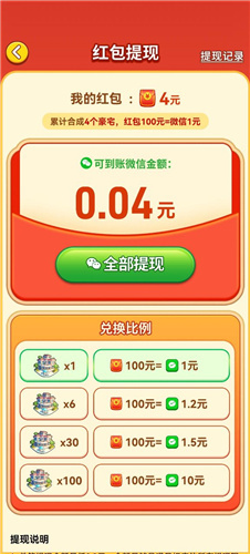 2、接下来是红包提现环节,提现比例为1%,最低满0.3元就能申请提现。