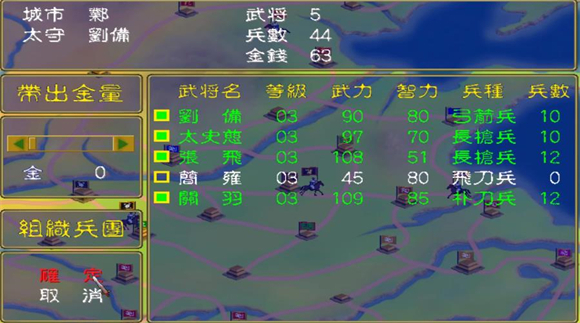 5、游戏初始提供5个年代可供选择,分别为:黄巾之乱、讨伐董卓、群雄割据、赤壁之战、三国鼎立。无论选择哪个年代,游戏都会在公元280年结束。其中黄巾之乱始于公元185年,这意味着选择该年代的玩家需要在95年的时间内完成统一全中国的目标,否则便视为失败。游戏开始时需挑选一位君主来实现统一中原的霸业,若选择董卓,其麾下兵强马壮,且有吕布辅佐,难度最低;选择刘备的话,开局时会面临四面受敌的困境,难度较大;选择曹操的难度则介于董卓与刘备之间,相对适中。