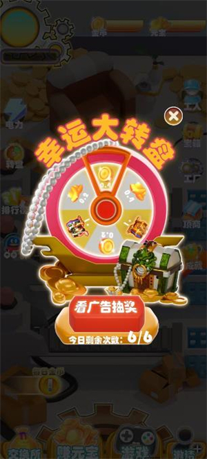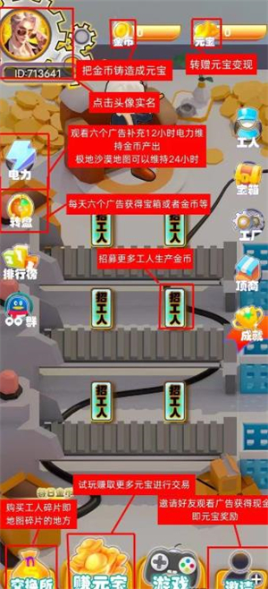 进入游戏后,点击头像完成实名认证,认证成功后会获得一名普通工人。每天观看六次广告可增加工厂电力,以此维持工厂机器和工人的正常运转,工厂每天会持续产生金币。